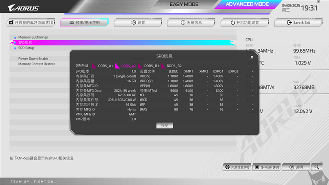在默认的简易模式下,内存信息中可以直接调整内存的EXPO设置和内存高频宽设置。