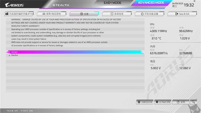 进入AMD超频设置页面之前,需要先接受使用协议,超频始终是有一定风险的,需要玩家自行承担。之后就可以对CPU的各项更具体的参数进行调节设置了。