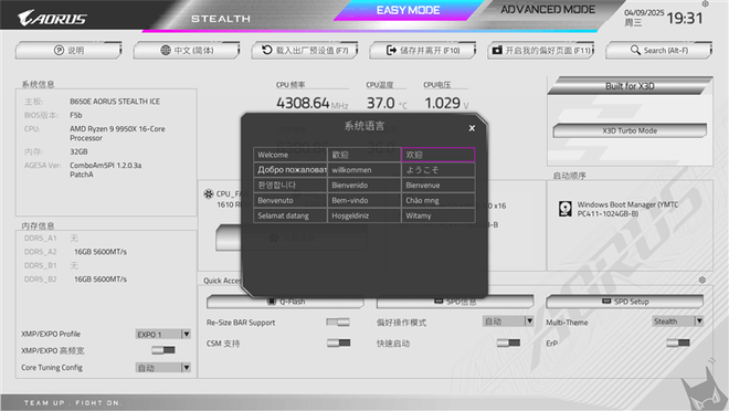技嘉B650E冰雕背插主板BIOS也同样采用了银灰色的主题配色,进入BIOS后我们首先把语言设置为中文。