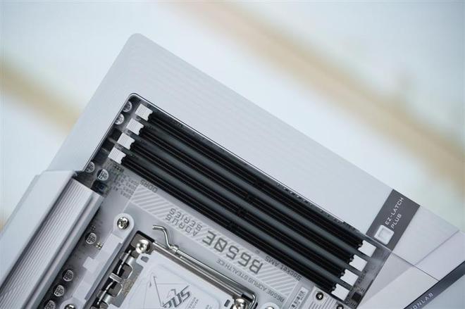 技嘉B650E冰雕背插主板的全貌,给人的第一感觉是非常干净,除了CPU和内存之外基本都会被超大面积的银白色散热装甲所覆盖。