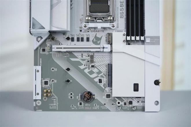 技嘉B650E冰雕背插主板的显卡插槽上方和背面都印有猫猫探头的图案,非常可爱。