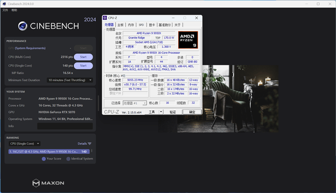 CINEBENCH 2024测试,CPU单核成绩140,多核成绩2316。