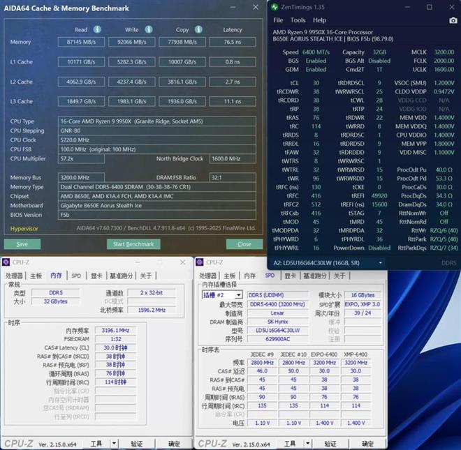 技嘉B650冰雕背插主板开启内存EXPO高频宽功能后,内存读取、写入和拷贝速度分别提升到87145MB/s、92066 MB/s和77938 MB/s,延迟为76.5ns。
