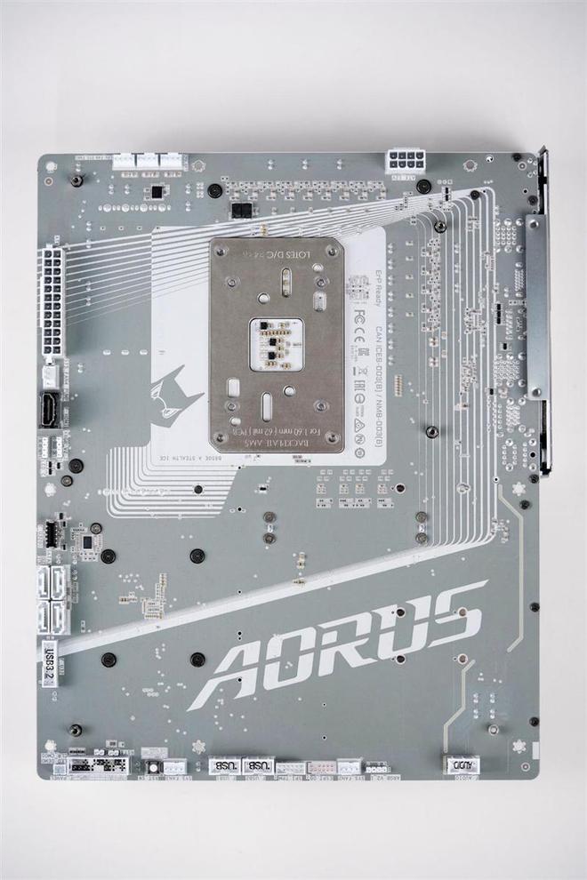 技嘉B650E冰雕背插主板背面同样也是被超大面积银白色散热装甲覆盖。