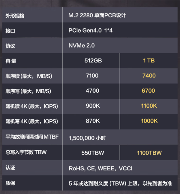 其顺序读写速度为7400MB/s、6700MB/s,随机读写4K为1100K、1000K,平均故障间隔时间为150万小时,提供五年质保1100TBW。