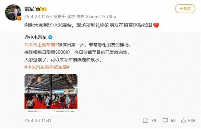 23日中午,小米汽车官方微博发文:媒体日第一天,非常感谢朋友们捧场,棒球帽每日限量5000份,今日份截至目前已发放完毕,大家逛累了,可以来领车展限定矿泉水。