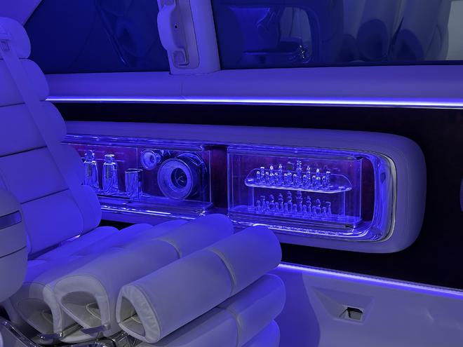 两侧木质饰板内嵌精致展柜,为个人物品提供收纳空间,双独立座椅之间的中控台同样设计为精致展柜,集成可折叠桌板,桌板展开后呈现为一块精致的国际象棋棋盘。