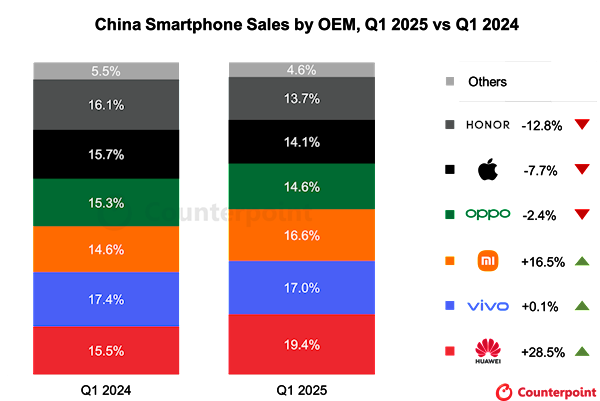4月25日消息,CounterPoint最新报告显示,在国补政策推动下,2025年第1季度中国智能手机销量同比增长2.5%。
