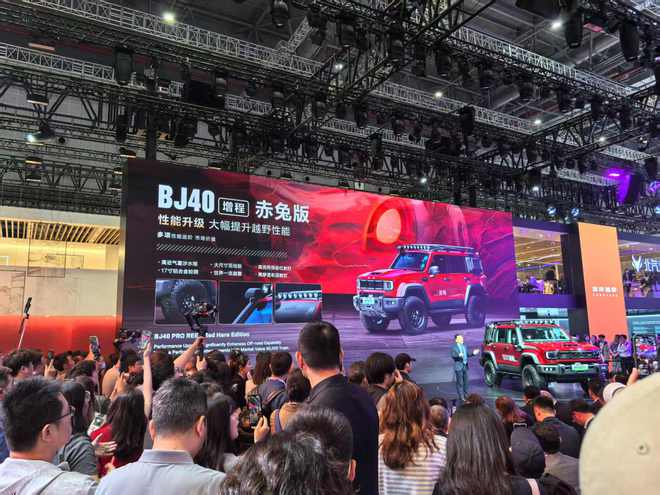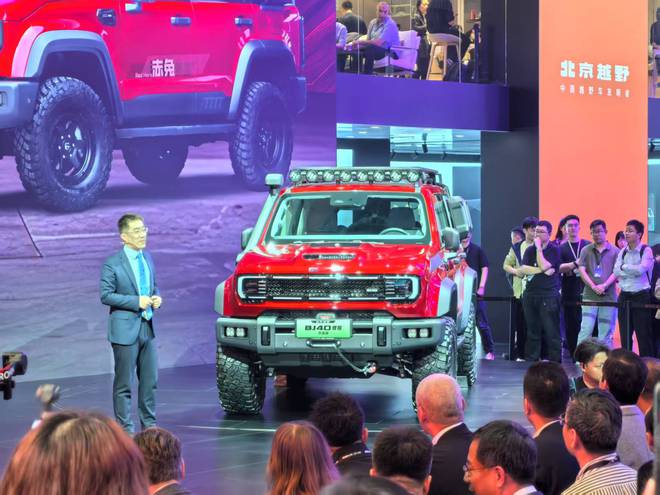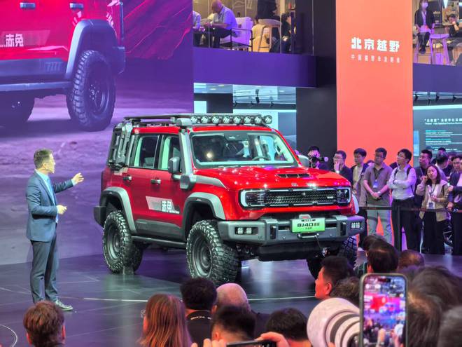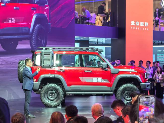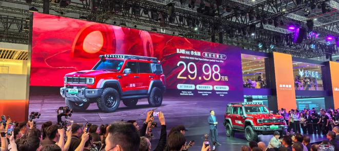 4月25日报道北京越野BJ40增程赤兔版在上海国际车展全球首发,限时优惠价29.98万元。新车在标准版基础上全面升级越野套件,包括绞盘、后拖车钩、涉水喉、车顶矩阵式照明灯等硬核配置,进一步强化户外穿越能力。