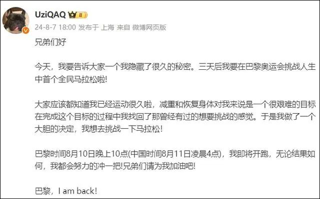 2024年8月,Uzi对外宣布,自己将参加巴黎奥运会大众马拉松的比赛。比赛时间在北京时间8月11日凌晨4点。Uzi称自己将在三天后在巴黎奥运会上挑战人生首个全民马拉松。他透露自己一直在运动、减重、恢复身体,并想在这个过程中找回以前挑战的感觉,因此决定挑战马拉松。