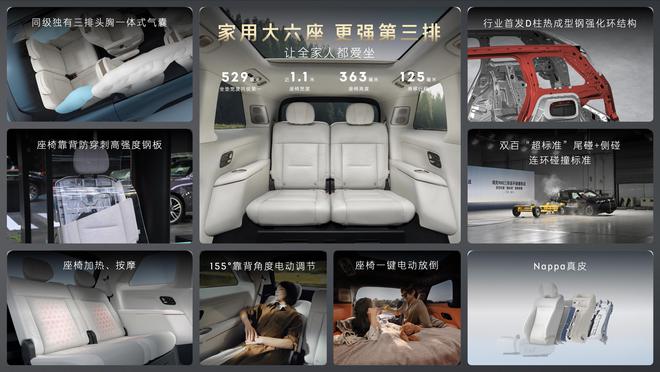 ·安全壁垒:三排连环碰撞测试通过,双百时速 “超标准” 极限首撞,全域安全 + 理念加持,三 “0” 健康座舱守护全家出行。