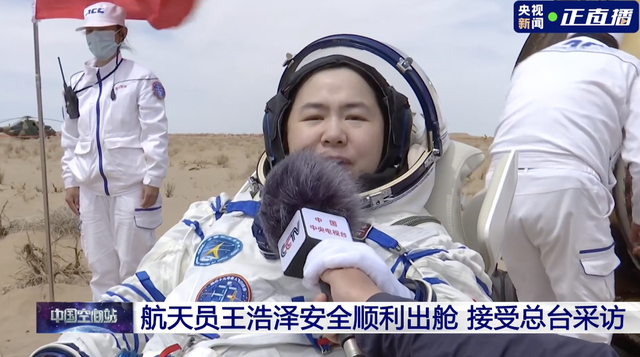 神舟十九号航天员王浩泽出舱,我国首位女性航天飞行工程师回到地球。出舱后,王浩泽接受了记者的采访。