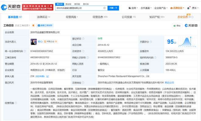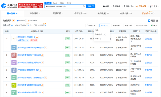 天眼查App显示,奈雪的茶关联公司深圳市品道餐饮管理有限公司成立于2014年5月,法定代表人为彭心,注册资本4.55亿人民币,经营范围包括日用百货销售、餐饮管理、住房租赁等,由深圳市品道集团有限公司、品道控股香港有限公司共同持股。对外投资信息显示,该公司对外投资30家企业,其中29家处于存续或者在业状态,包括田野创新股份有限公司、深圳市美好自有力量投资有限公司、深圳市奈雪饮料科技有限公司等。风险信息显示,今年3月,该公司因产品质量违法行为,被深圳市市场监督管理局南山监管局通报批评。