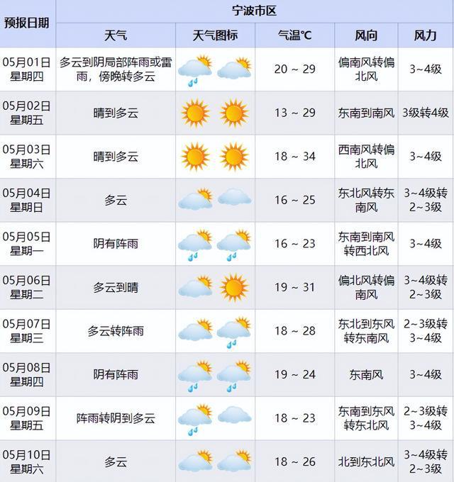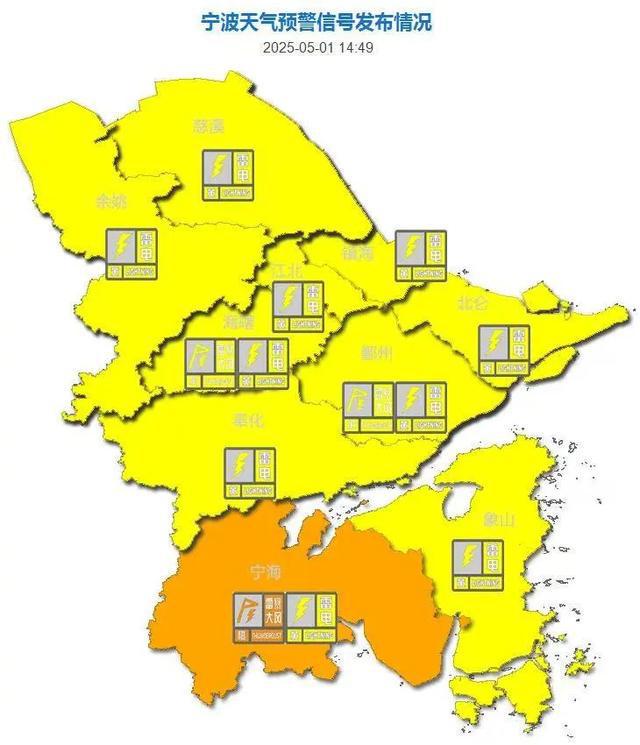 其中,宁波全域发布雷电黄色预警;海曙区、鄞州区发布雷暴大风黄色预警;宁海县发布雷暴大风橙色预警信号。