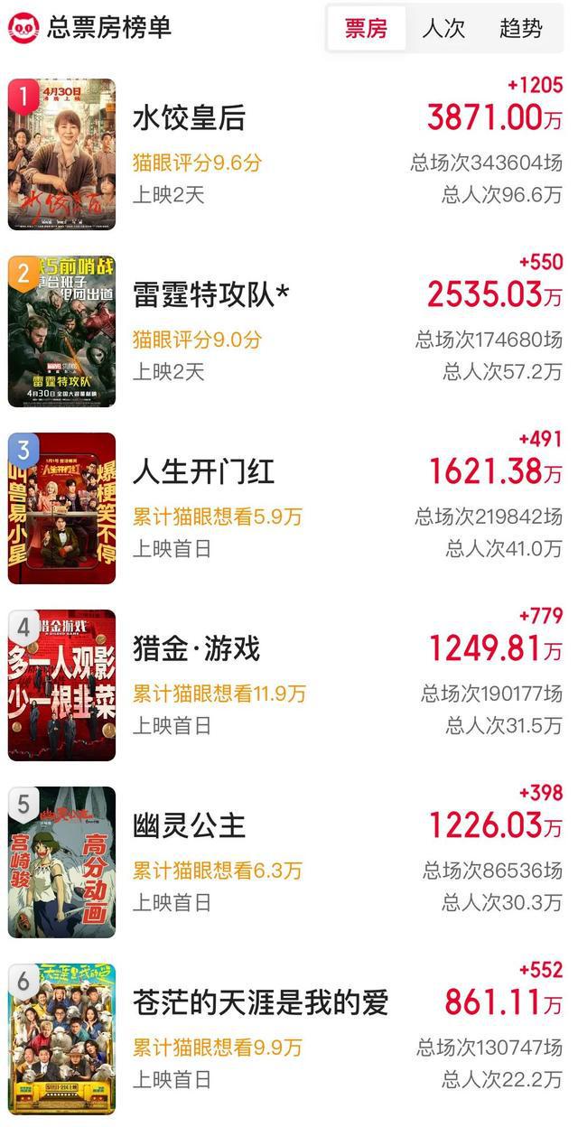 另据网络平台数据,截至5月1日10时20分,2025年“五一档”新片总票房(含点映及预售)突破1.2亿,影片《水饺皇后》《雷霆特攻队*》《人生开门红》《猎金·游戏》《幽灵公主》《苍茫的天涯是我的爱》暂列前六,其中《水饺皇后》暂列“五一档”票房榜第一。