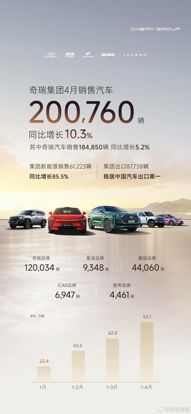 5月2日,奇瑞集团宣布4月销售汽车200760辆,同比增至10.3%。