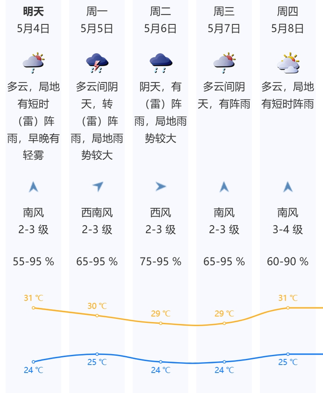 4日多云,局地有短时(雷)阵雨,早晚有轻雾,气温24-31℃,午间体感较热;