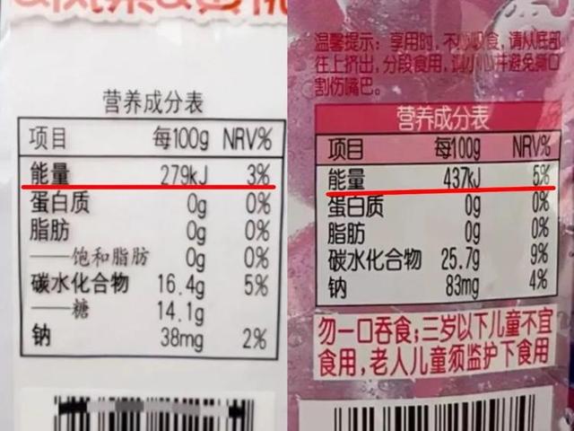 以喜之郎的果冻为例,葡萄果肉果冻的能量标注为279kJ/100g,而葡萄口味的蒟蒻果冻能量则达到了437kJ/100g,比“普通”果冻多的可不是一星半点。