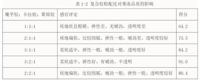 当魔芋胶、卡拉胶和黄原胶分别按照3:2:1的比例混合,果冻的感官评价最好,不仅弹性好,柔软适中还有嚼劲。而其他配比下的果冻质地、弹性嚼劲方面都会略差一些。