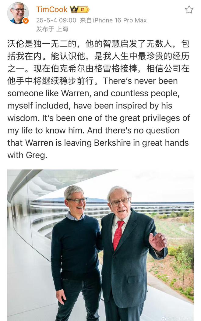 今日,苹果CEO库克发文致敬巴菲特,他说“沃伦是独一无二的,他的智慧启发了无数人,包括我在内。能认识他,是我人生中最珍贵的经历之一。现在伯克希尔由格雷格接棒,相信公司在他手中将继续稳步前行。”