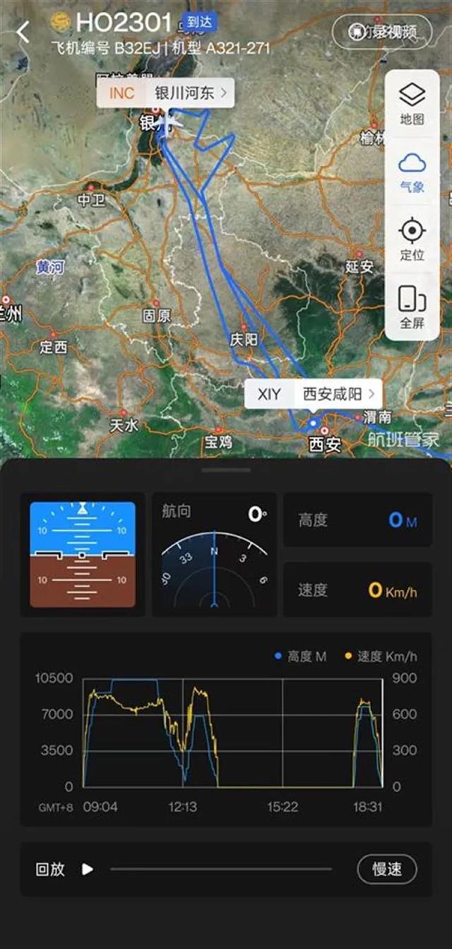 航班管家的信息显示,飞机落地西安后,又于当天17时35分起飞,并于18时31分落地银川,共延误6小时36分。航行图上,飞机在准备降落银川、随后飞往银川的轨迹图很像一把“扳手”。