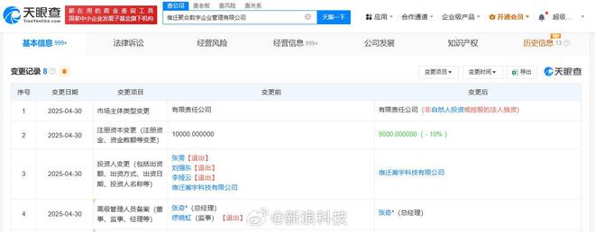 天眼查App显示,近日,宿迁聚合数字企业管理有限公司发生工商变更,刘强东退出股东行列,李娅云、张雱由直接持股变更为间接持股,同时公司注册资本由1亿人民币减至9000万人民币。