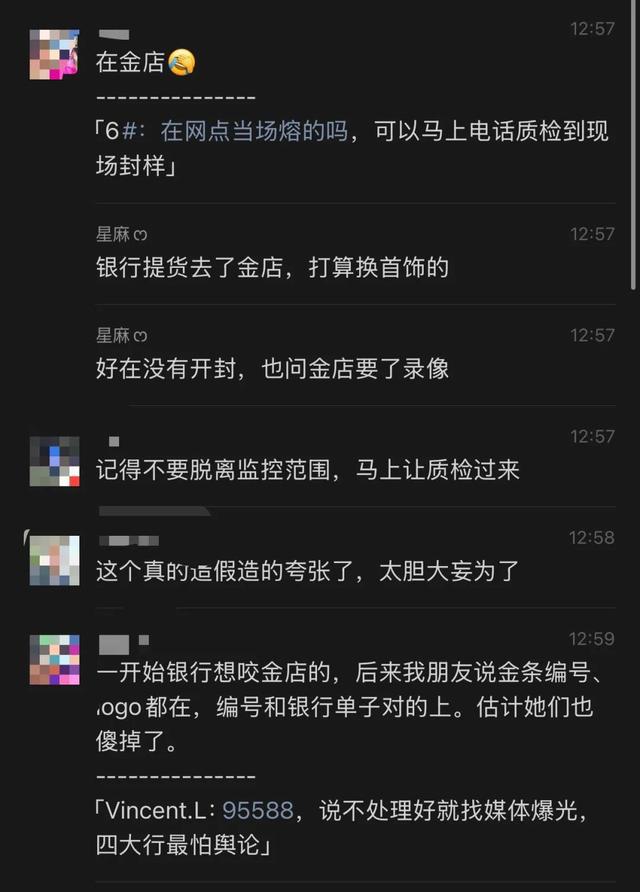 该网友表示,系在银行提货后去金店打算换成首饰,“好在没有开封,也问金店要了录像。”“一开始银行想说是金店的(问题)。后来,我朋友说金条编号、Logo都在,编号和银行单子对的上。”“你们曾经换过的,要不也去熔一下看看。”