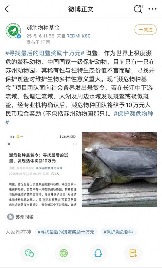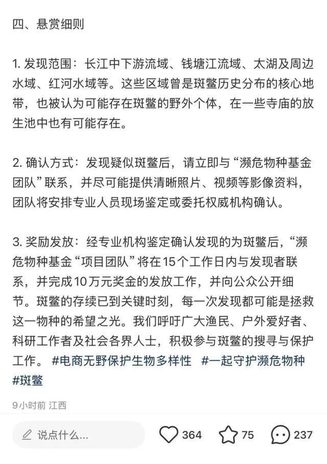 帖子中提到,“发现疑似斑鳖后,请立即与‘濒危物种基金团队’联系,并尽可能提供清晰照片、视频等影像资料,团队将安排专业人员现场鉴定或委托权威机构确认。经专业机构鉴定确认发现的为斑鳖后,‘濒危物种基金团队’将在15个工作日内与发现者联系,并完成10万元奖金的发放工作,并向公众公开细节。”