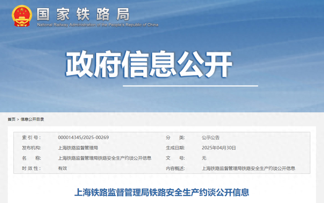 近日,国家铁路局网站发布《上海铁路监督管理局铁路安全生产约谈公开信息》,全文如下: