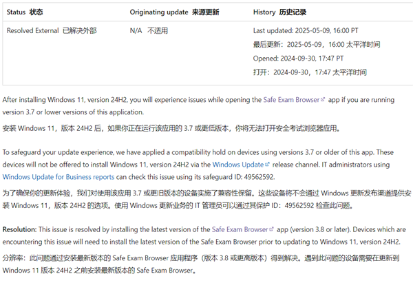 经过7个月的修复和调整,微软确认该问题已在Safe Exam Browser 3.8版本中得到解决。微软建议受影响的用户将该浏览器更新至3.8或更高版本,之后设备将能够重新获得Win11 24H2的更新推送。