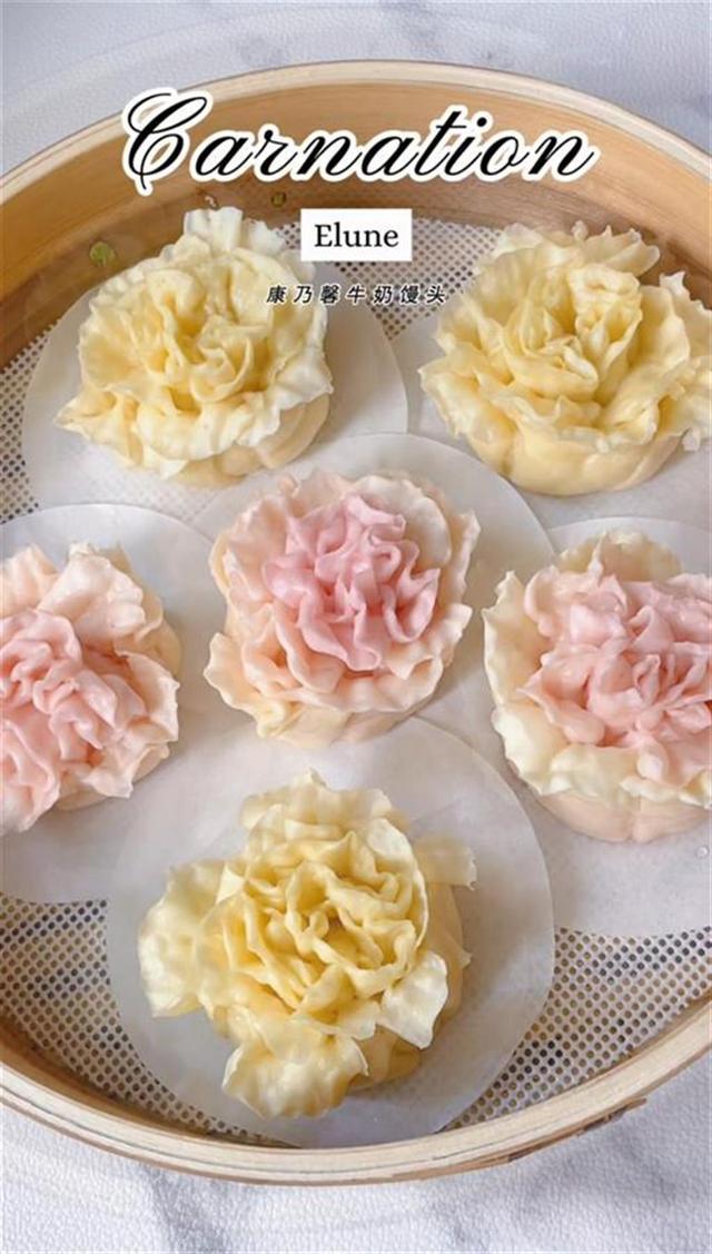 接着,方女士向记者介绍起制作过程,其实不算太复杂,准备好面粉、酵母、牛奶及一些可食用的果蔬粉,揉成光滑的面团即可。然后做康乃馨馒头的造型可能会花多一点的时间,因为花瓣需要一瓣一瓣地压薄折叠,组合在一起,做成康乃馨的样子。最后把做好的康乃馨馒头放到蒸锅里蒸熟,就大功告成。因为加入的液体是牛奶,所以康乃馨馒头会有甜甜的奶香味。