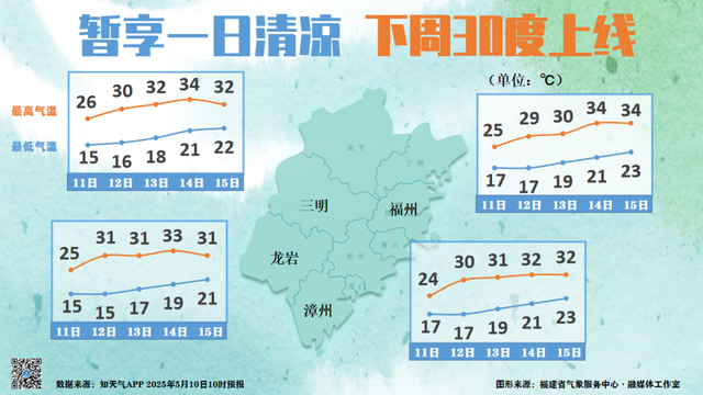 气温方面,今天气温重回25℃上下,可以暂享一日清凉,下周气温重回30℃以上,福州、三明14日甚至会达到34℃,龙岩也达33℃。