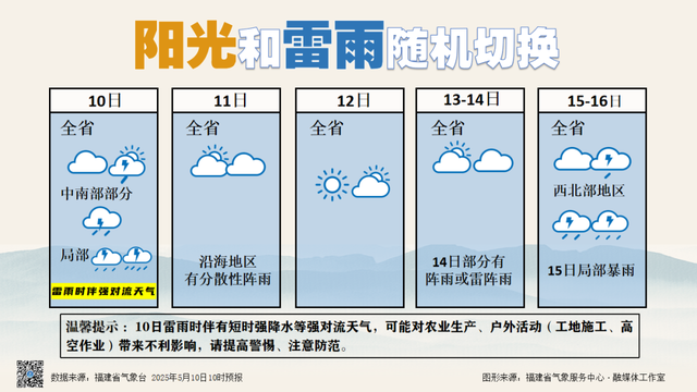 据福建气象,11日,全省多云到阴,沿海地区有分散性阵雨,12日,天气转晴,不过下周后期,也就是14日~17日,我省还会有一轮较明显降雨天气过程。