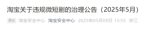 5月9日,“淘宝安全中心”公众号发布《淘宝关于违规微短剧的治理公告(2025年5月)》称,4月,淘宝平台下架存在低俗、畸形婚恋、宣扬拜金享乐主义、封建迷信等价值观导向不良问题的微短剧45部。