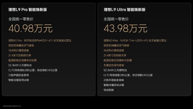 | 理想L9 | 外饰:增雅灰特别版冷光漆、专属哑光金车身装饰、全新轮毂 内饰:全新黑棕双色内饰、十八点热石揉捏按摩座椅(四个独立座椅) 底盘:换双腔魔毯空气悬架 功能:21.4英寸吸顶屏、、800万像素流媒体后视镜、新形象的理想同学(3D毛绒形象),增加记忆能力、超级助手(可自主规划执行复杂执行的助手,联动车机执行点外卖、查询快递等外部任务) 芯片:ADPro芯片升级为新一代地平线征程6M芯片; ADMax芯片升级为英伟达Thor-U芯片 激光雷达:标配ATL全天候激光雷达 VLA:下半年ADMax平台升级VLA司机大模型 |