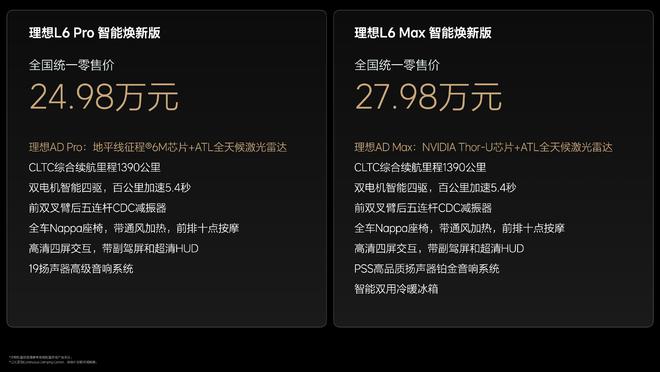 | 理想L6 | 外饰:增天青色特别版珍珠漆、全新轮毂 内饰:全新黑棕双色内饰 底盘:重新调校CDC减震器 功能:新形象的理想同学(3D毛绒形象),增加记忆能力、超级助手(可自主规划执行复杂执行的助手,联动车机执行点外卖、查询快递等外部任务) 芯片:ADPro芯片升级为新一代地平线征程6M芯片; ADMax芯片升级为英伟达Thor-U芯片 激光雷达:标配ATL全天候激光雷达 VLA:下半年ADMax平台升级VLA司机大模型 |