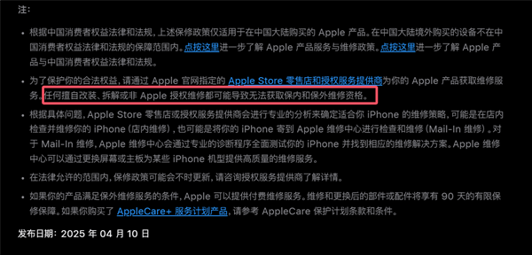 在此需要提醒的是,苹果在官网提到,任何擅自改装、拆解或非Apple授权维修都可能导致无法获取保内和保外维修资格。