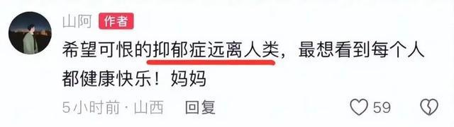 “山阿”妈妈在评论区留言称:“希望可恨的抑郁症远离人类,最想看到每个人都健康快乐!”
