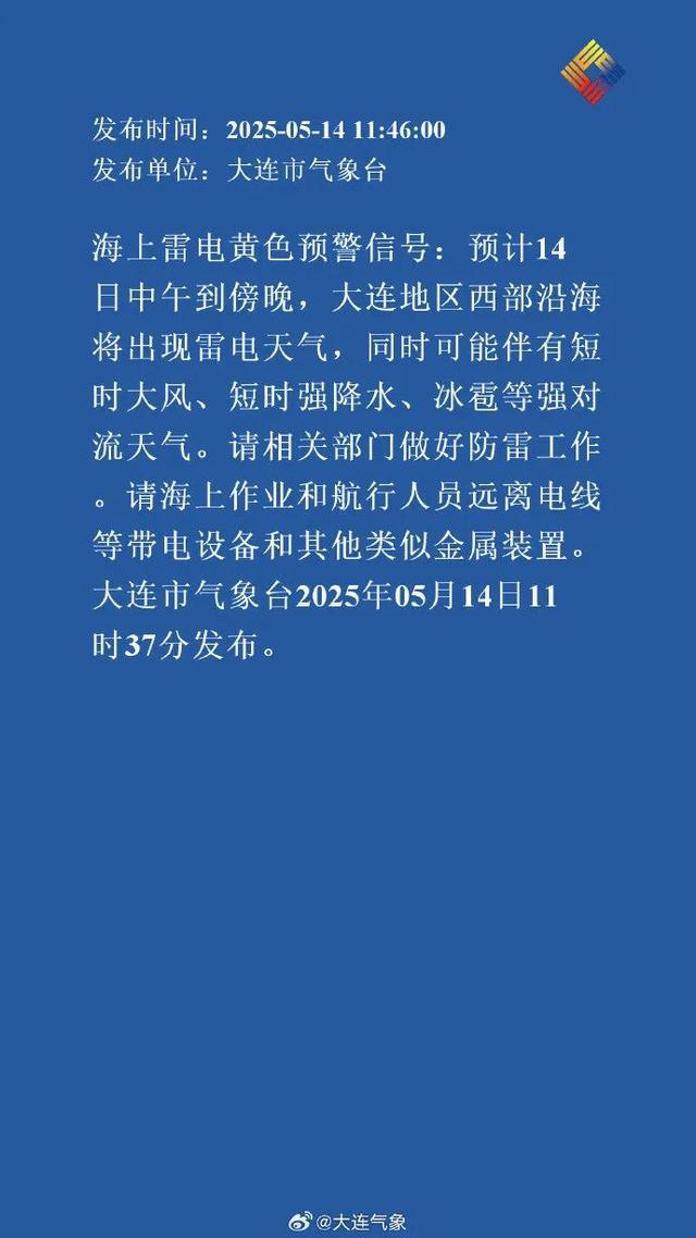 预计14日中午到傍晚,大连地区西部沿海将出现雷电天气,同时可能伴有短时大风、短时强降水、冰雹等强对流天气。