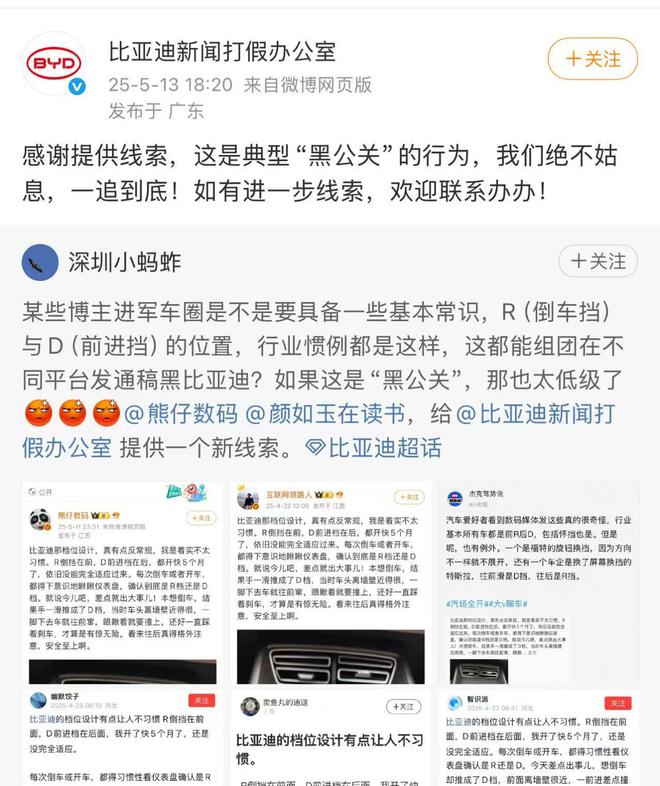 博主称“R档在前、D档在后”反常规,比亚迪:典型的“黑公关”行为 访客 2025-05-14 15:53:19 13987 抢沙发 默认 近期,有多个博主发文质疑比亚迪的档位设计不合理,R档在前,D档在后,开了5个月依然不能完全适应。对此,比亚迪新闻打假办公室回应:这是典型“黑公关”的行为,我们绝不姑息,一追到底。 标签: 比亚迪 这是 海报 阅读 QQ 分享 微博分享 微信分享 分享 上一篇甘薇宣布与贾跃亭离婚:遭丧偶式婚姻,连我生日都忘了,已拉黑 下一篇哪吒汽车原CEO张勇停更7个月,哪吒官微保持更新 甘薇宣布与贾跃亭离婚:遭丧偶式婚姻,连我生日都忘了,已拉黑上一篇 哪吒汽车原CEO张勇停更7个月,哪吒官微保持更新下一篇 相关推荐 比亚迪这是 比亚迪全新车型海豹08谍照曝光,预计2023年第一季度推出亮相 2026-01-13 比亚迪海狮08与海豹08谍照曝光,车长超5米,高阶辅助驾驶配置亮相 2026-01-13 赵长江官宣加盟智界,感恩比亚迪栽培,新旅程开启 2026-01-13 樊振东收获留洋首冠,荣膺MVP,夺冠时刻的喜悦与荣耀 2026-01-05 轿车挂树,车内人员被困紧急救援进行中 2026-01-03 比亚迪辟谣,不会推出飞行汽车 2025-12-29 华为nova 15系列压轴登场,余承东宣布加量不加价,新品非常香 2025-12-28 小米17 Ultra两亿像素详解,与相机变焦镜头技术一脉相承 2025-12-23 发表评论取消回复 快捷回复: 评论列表 (暂无评论,13987人围观)参与讨论 还没有评论,来说两句吧...