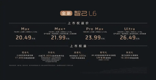 5月13日报道全新智己L6(参数丨图片)正式上市权益价区间20.49-26.49万,指导价21.99-27.99万元,推出Max,Max+,Max Pro和Ultra四个版本。新车将全系配备800V高压平台,灵犀数字底盘升级至2.0,超远距高精度激光雷达等智电核心配置。此次全新智己L6实现颜值升级,智能升级,舒适升级。