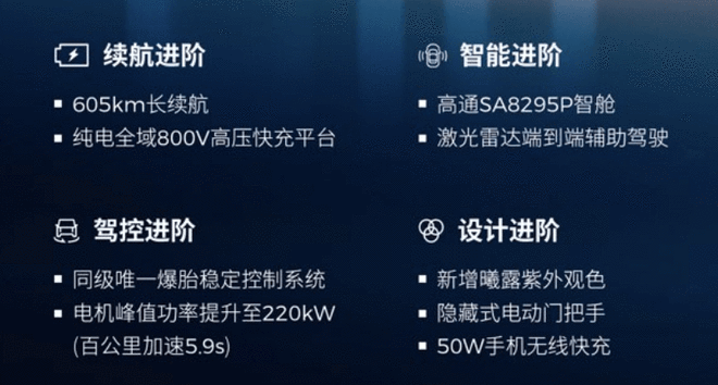 动力方面,碳化硅SiC三合一高效电驱总成峰值功率提升至220kW,零百加速仅需5.9秒,高压电驱平台综合效率超92%,续航提升6%。同时搭载了零跑最新自研LMC一体化运动融合控制底盘,可实现爆胎稳定控制、动态转向辅助及高速过弯预稳定控制。