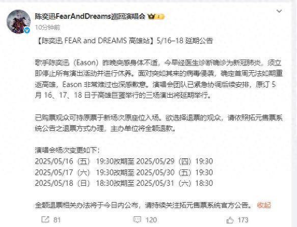 5月15日,@陈奕迅FearAndDreams巡回演唱会 发布延期公告: