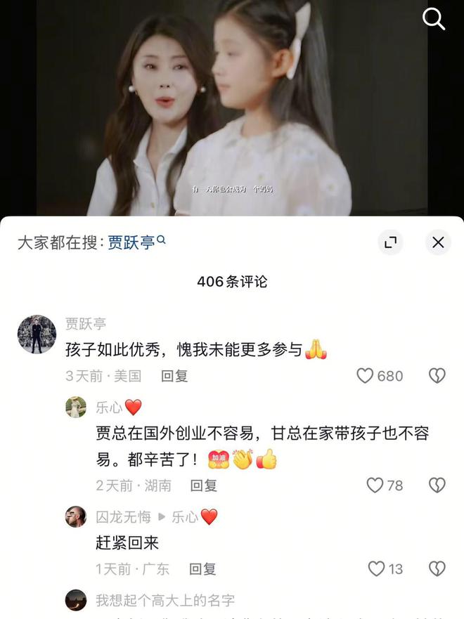 值得注意的是,贾跃亭在视频下评论“孩子如此优秀,愧我未能更多参与”,时间大概是在5月13日。而就在5月14日,甘薇在社交平台宣布与贾跃亭离婚,并表示离婚的原因是遭遇丧偶式婚姻,在感情方面一味的付出和努力,得到的回报却是少之又少,所谓的回报不是金钱和利益,而是简单的问候、陪伴、情绪价值。