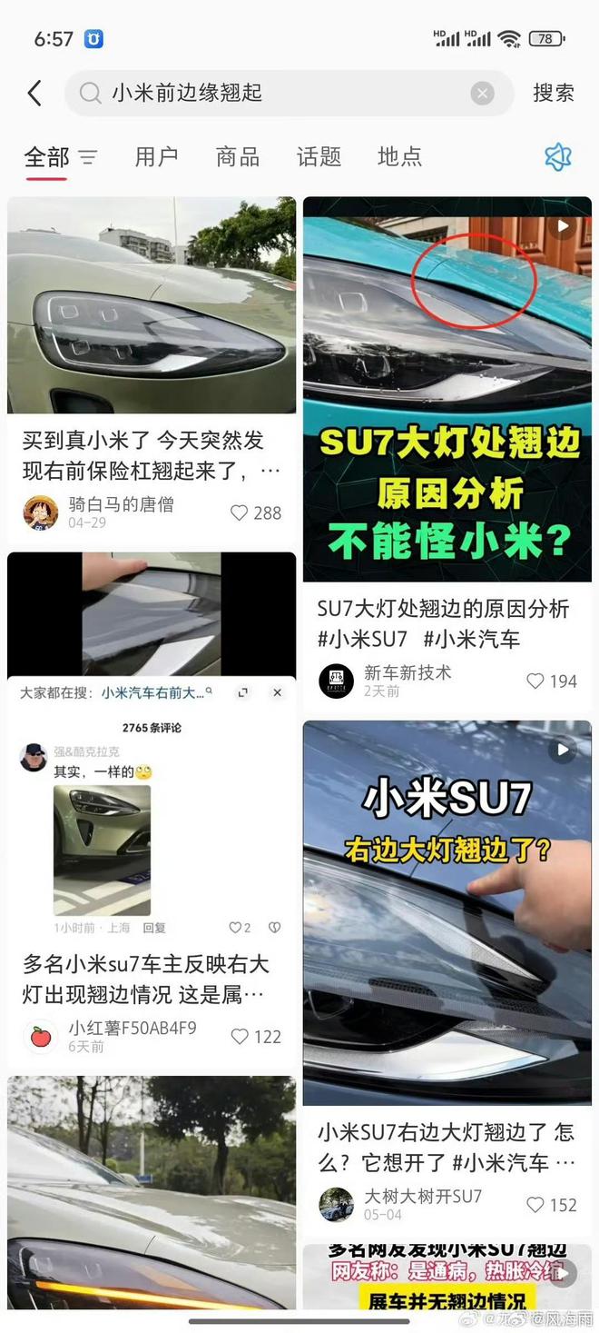 近日有多名小米SU7车主反映,汽车大灯与翼子板接缝处出现鼓包、翘边现象。