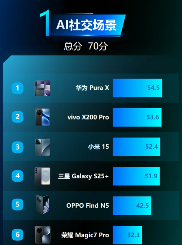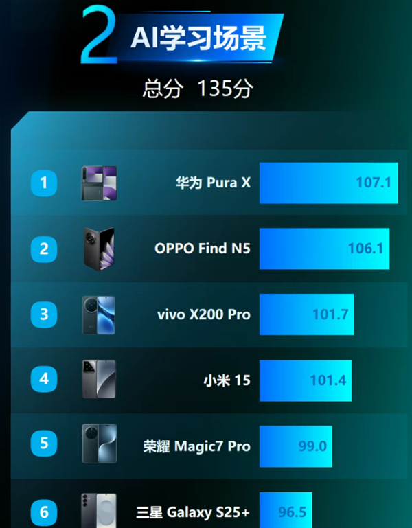 在AI社交场景(总分70分)中,华为PuraX获得54.5分,AI学习场景(总分135分)华为PuraX分数为107.1分。