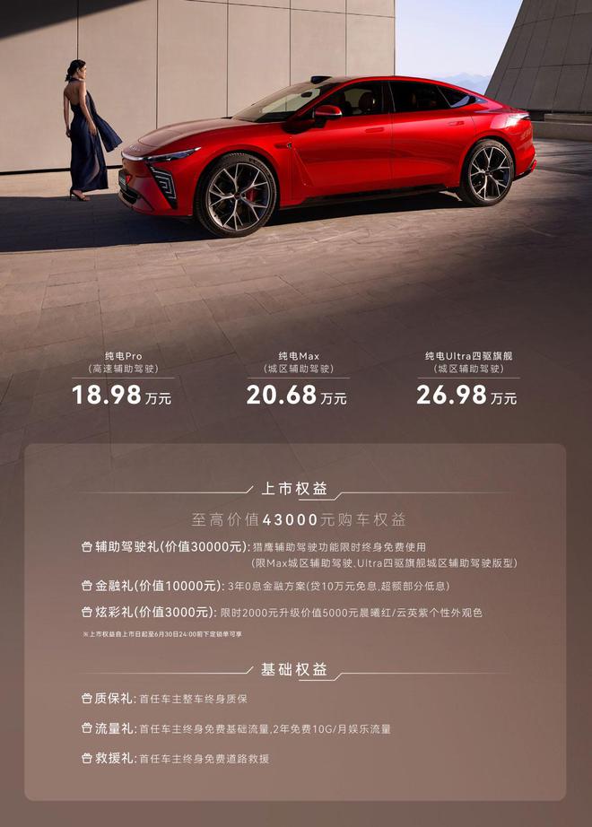 即日起至6月30日24:00前下定锁单可享至高价值43,000元的购车权益,包含价值30,000元的辅助驾驶礼,即猎鹰(参数丨图片)辅助驾驶功能限时终身免费使用(限Max版及Ultra四驱旗舰版);