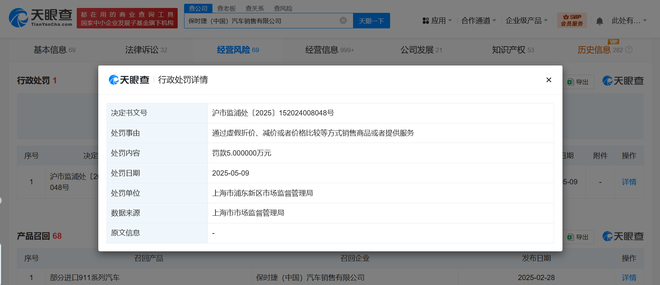 天眼查天眼风险信息显示,近日,保时捷(中国)汽车销售有限公司因通过虚假折价、减价或者价格比较等方式销售商品或者提供服务,被上海市浦东新区市场监督管理局罚款5万元。