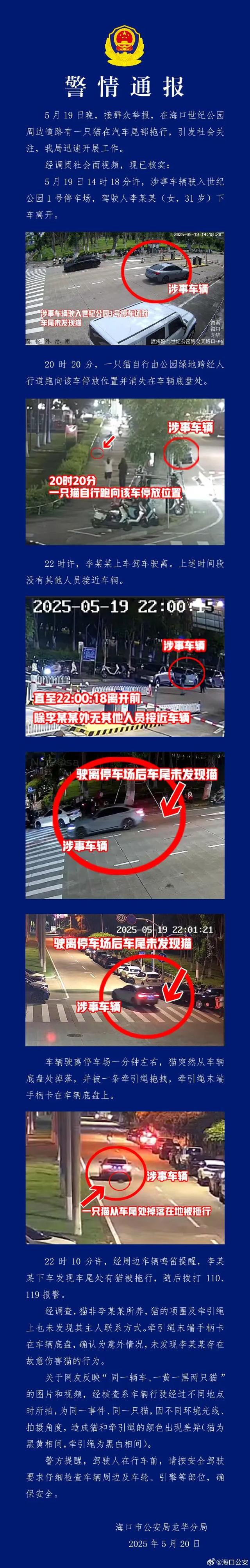 网传“宝马车拖行虐猫”?海口警方通报:确认系意外情况