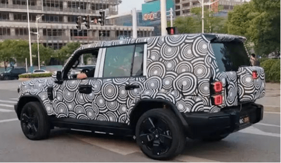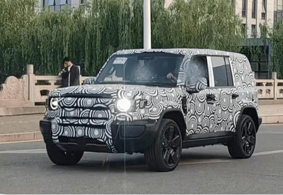 车头部分延伸较长,车窗下沿巧妙地低于发动机舱盖,前翼子板处装配黑色装饰件,疑似融合了侧后向摄像头功能。实车选用了常规造型的门把手,搭配黑色五辐轮辋,细节之处似乎还增设了电动侧踏板,显著提升了上下车的便利性。尾部则采用侧开式尾门和方形“小书包”储物箱(非备胎),尾灯为竖向排列的方形灯组,整体风格硬朗且辨识度高。